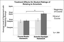 Hearing the personal narrative of scientists tore down existing stereotypes about the field, resulting in higher grades and increased interest in a scientific career. Most of all, the students saw scientists as not so different from themselves. Before the semester, only 35% of students felt they could relate to scientists. After the semester, 79% of Scientist Spotlight students found scientists relatable.
